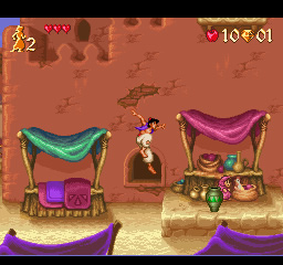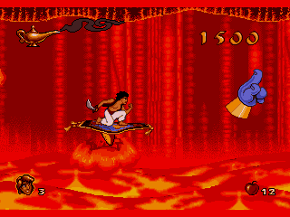 Pour la petite anecdote, Aladdin est le tout premier jeu voyant naître une association directe entre les animateurs de Disney et une équipe de développement : En utilisant une technique spécifiquement créée pour ce jeu par David Perry (le Digicell), il leur est possible de compresser la multitude d’étapes d’animation livrées par Disney dans la faible mémoire des cartouches de jeu de l’époque, le tout sans pertes visuelles.