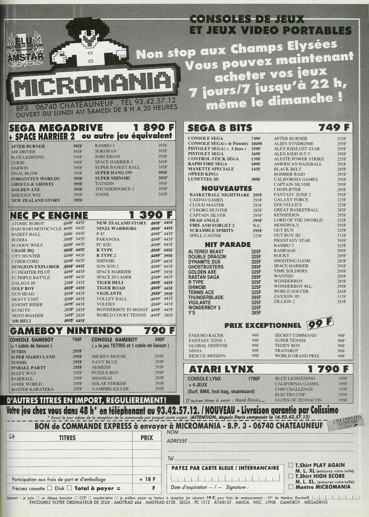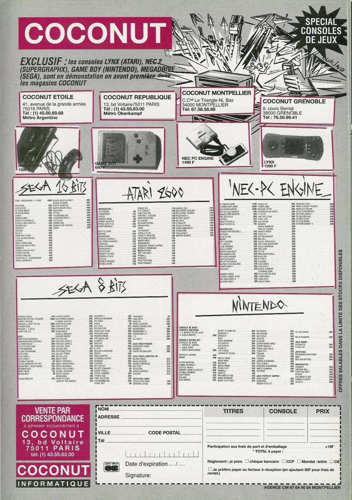 Une vingtaine de lignes cachées en fin fond de magazine pour présenter, l’air de rien, l’arrivée de la Neo Geo en France via le magasin d’import Ultima, et mettent déjà en avant le prix exorbitant de ses jeux. Les meilleurs jeux du mois, tous sur PC Engine, sont Formation Soccer (96%), Granzort (94%), Blue Blink (89%), Shangai 2 (85%) et Splatterhouse (81%).